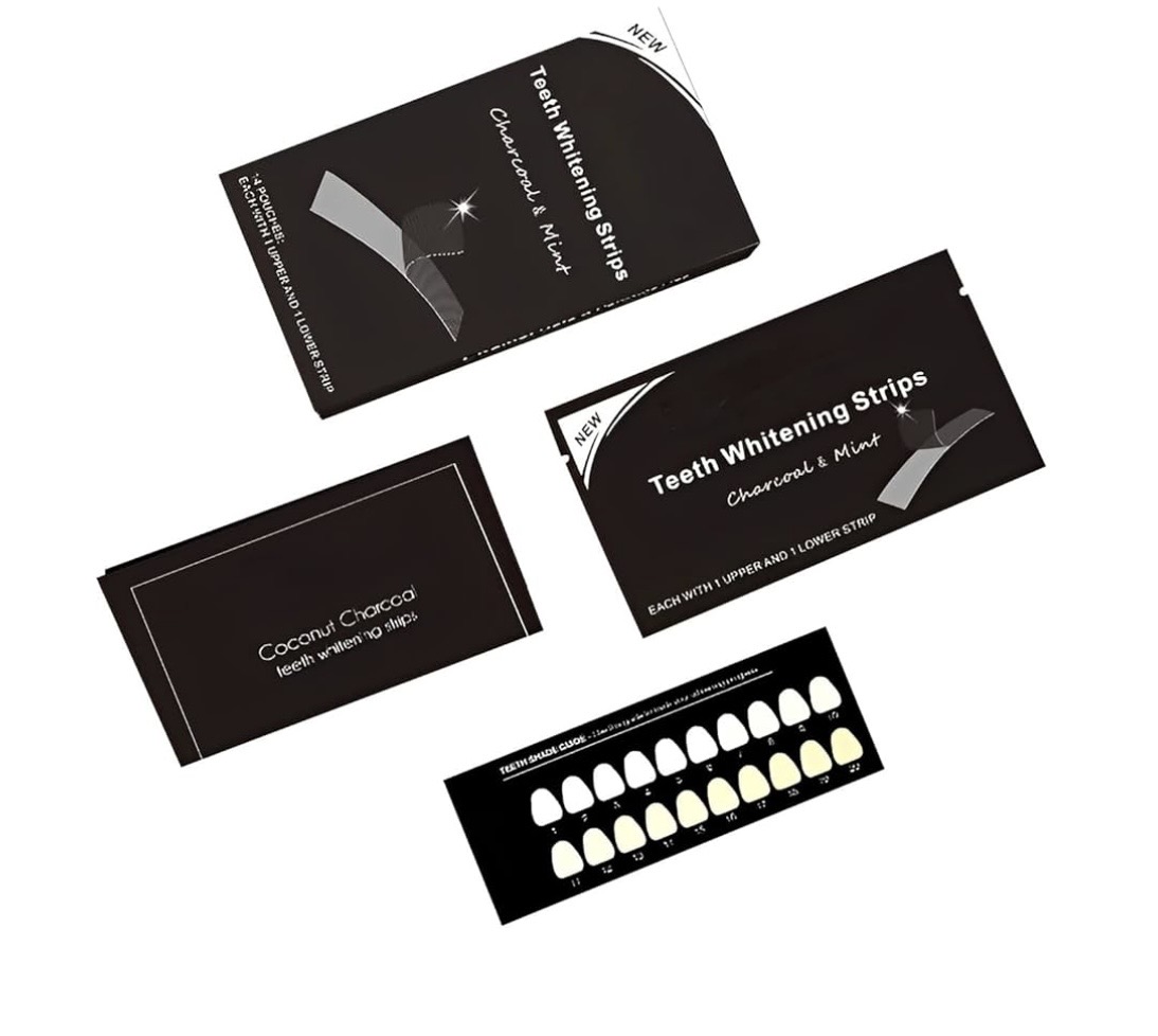 Tiras blanqueadoras con carbón activo, producto de cuidado bucal elaborado con ingredientes 100% naturales: aceite de coco y carbón activado de coco.